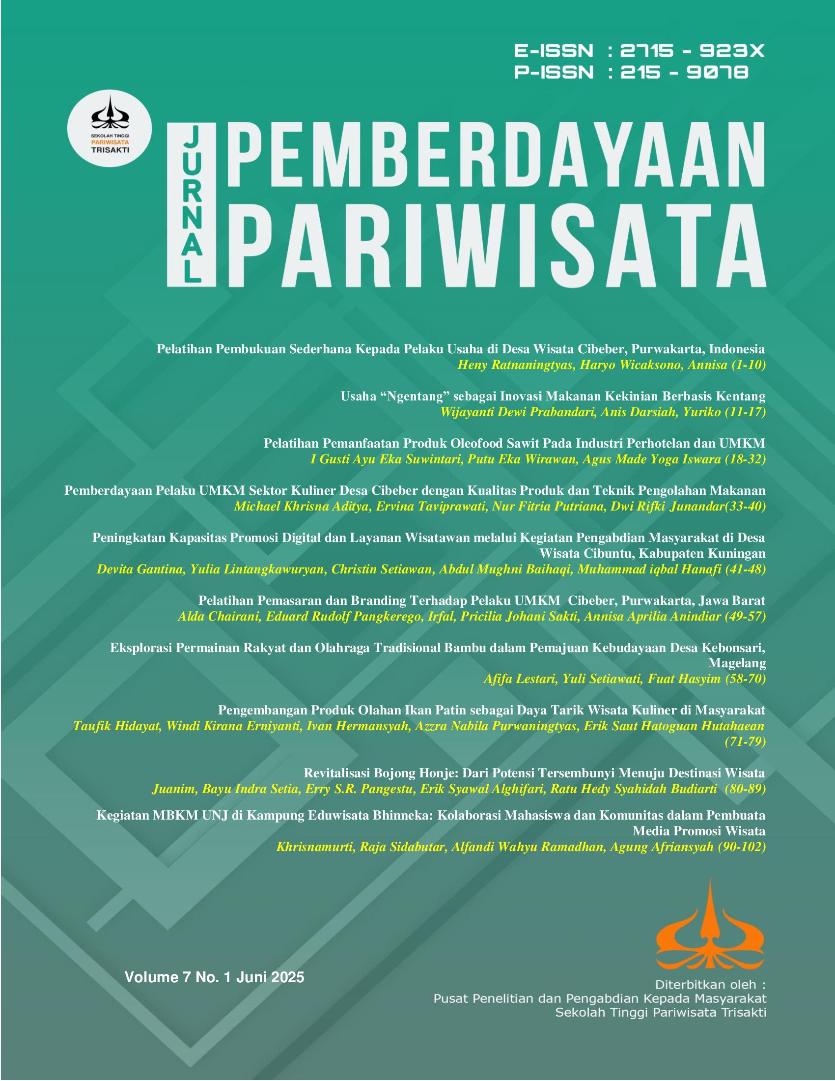 This community empowerment program was implemented in Cibuntu Tourism Village, Kuningan, West Java, in response to the low utilization of digital technology in tourism promotion and service delivery. The main objective was to enhance the digital capacity of local tourism actors, including tourism awareness groups, tourism-based micro-enterprises, and village officials. A participatory approach was employed, involving practical training sessions, the development of digital promotion strategies based on local potential, and technical assistance. Data collection methods included interviews, focused group discussions, and field observations. The program’s effectiveness was assessed through pre- and post-tests to measure the participants’ improvement in digital competencies. The results showed a significant increase in digital engagement: active use of social media rose from 15% to 75%, digital content creation skills improved from 10% to 60%, and the use of online booking platforms increased from 5% to 40%. The activities proved effective in empowering the local community to use digital tools in promoting tourism and delivering services. Moreover, the program fostered community participation, a sense of ownership, and sustainability in digital tourism development. To maintain the program's impact, follow-up training and regular technical mentoring are recommended to support continuous improvement in digital capacity.